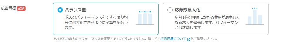 ※バランス型/応募数最⼤化は、複数求⼈の場合に設定予算をどの求⼈に割り振るかを決めるための設定であり、効果を保証するものではございません。
