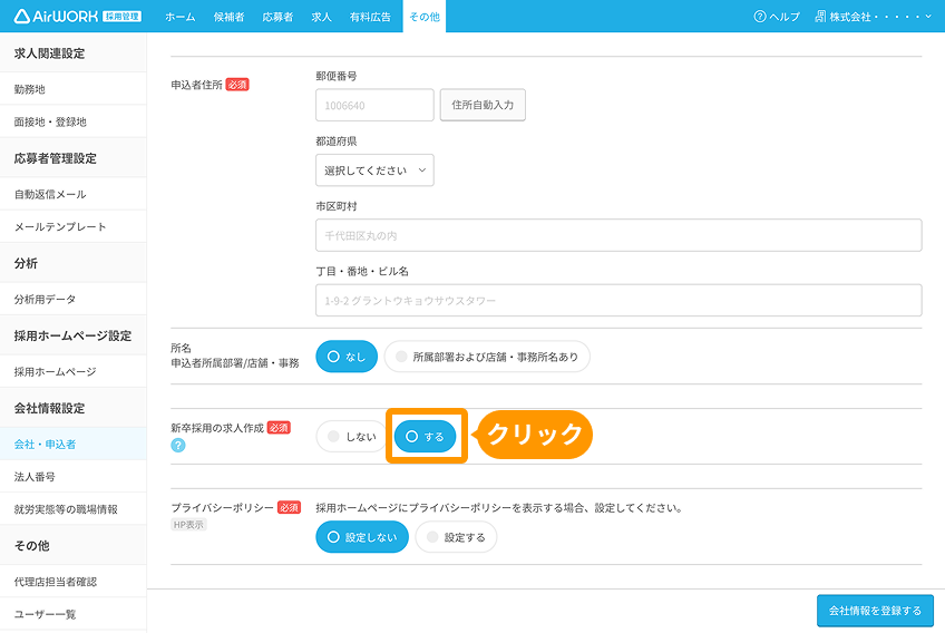 ①まず、Airワーク採用管理にログインし、「その他」画面で「会社・申込者」をクリック