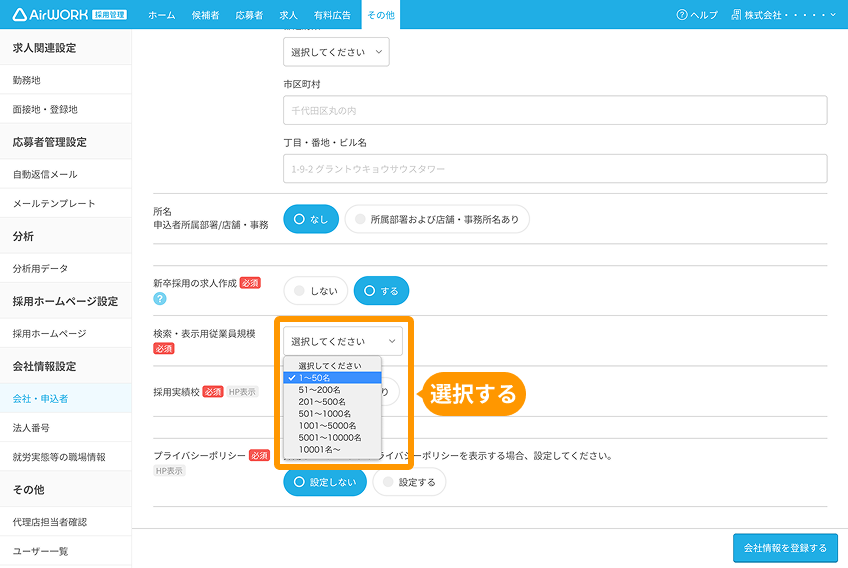 ③「検索・表示用従業員規模」で、現在の従業員数を選択