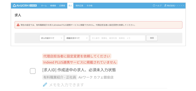 ▼既存のアカウントからはIndeed PLUS連携ができないため、下記のようなアラートが表示されます。